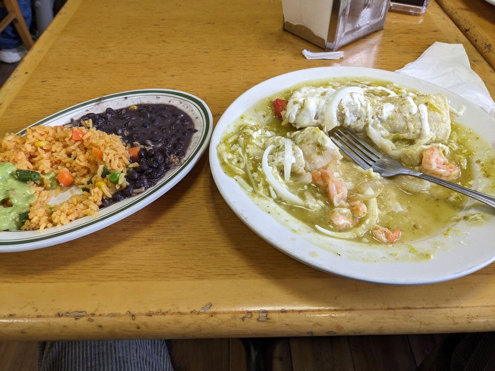 Servido con arroz, frijoles, guacamole y tortilla. Served with rice, beans, guacamole, and tortilla.