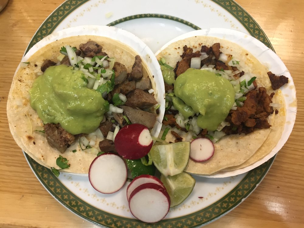 Pork. Todos servidos con cebolla, cilantro, guacamole, rabano y cebollinas. All come with onions, cilantro, guacamole, radishand, and cambray onion.